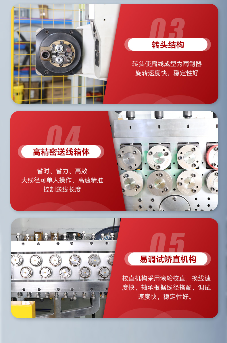 5.校直機(jī)構(gòu)橫向立向11*2校直方式,校直軸承根據(jù)原材料仿形貼合校直,直線度完全符合行業(yè)產(chǎn)品要求。